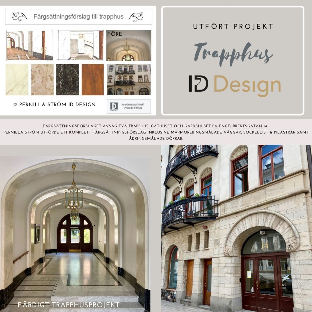 För några år sedan färgsatte jag två trapphus på Engelbrektsgatan i Stockholm. Häromdagen gick jag förbi och kikade in. Det ser väldigt fint ut fortfarande. Innan jag fick färgsättningsuppdraget såg trapphuset enkelt och glåmigt ut, sådär som trapphus gör utan någon speciell finess. Det var ljusa målade väggar utan detaljer eller dekor.