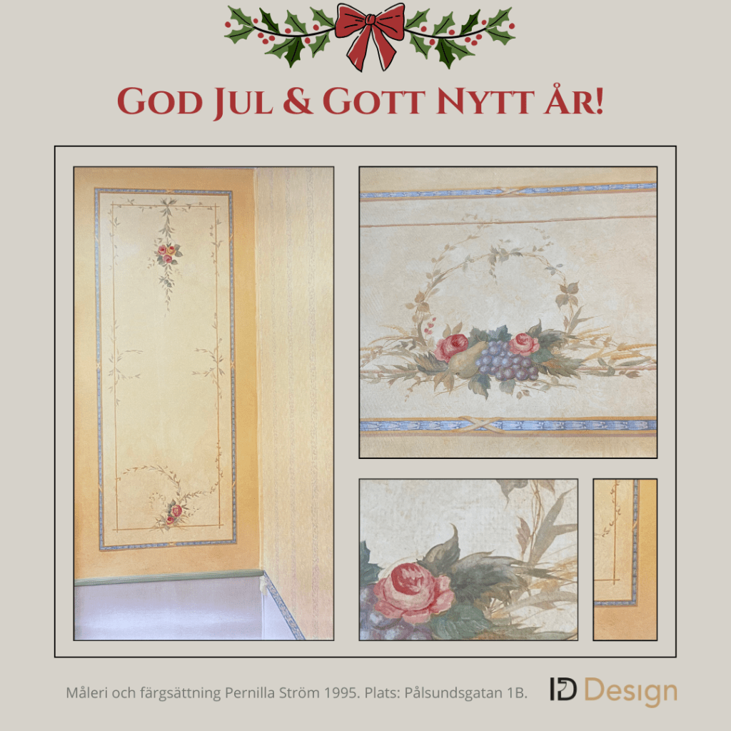 Inspirerad av den kursen och äldre måleri som jag hade sett på olika slott, målade jag upp en vägg med tre olika fält i min dåvarande affärslokal. Inspiration är också från den skickliga dekorationsmålaren från 1700-talet, Lars Bolander (1732-1795). Det sägs att han var Gustav den III:s hovmålare och han målade bland annat på Sturehovs slott. Både slottet och hans måleri var en stor inspirationskälla för mig då.