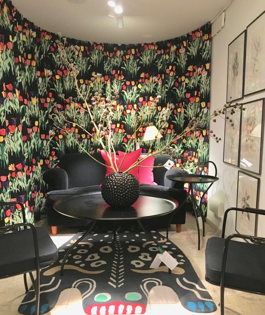 Nu är det snart advent och julen närmar sig vilket syns i butiken som inspirerar med ett färg- och mönstercrescendo. Josef Frank har formgivit många av de tapet- och tygmönster som finns i butiken och Estrid och Frank hade ett mycket gott samarbete.