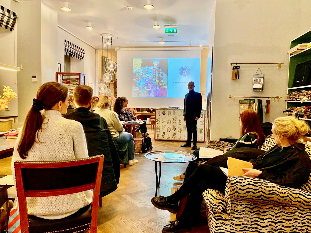 I veckan som gick fick vi besöka inredningsateljén på Svenskt Tenn och lyssna på en intressant föreläsning av Thommy Bindefeldt. Vi fick ta del av företagets historia, men också höra om mönsterkompositioner och teknik, till exempel hur Josef Frank skapade mönsterrapporter för screentryck med sex färger som genom ett smart drag blev till tio färdiga tryckfärger.