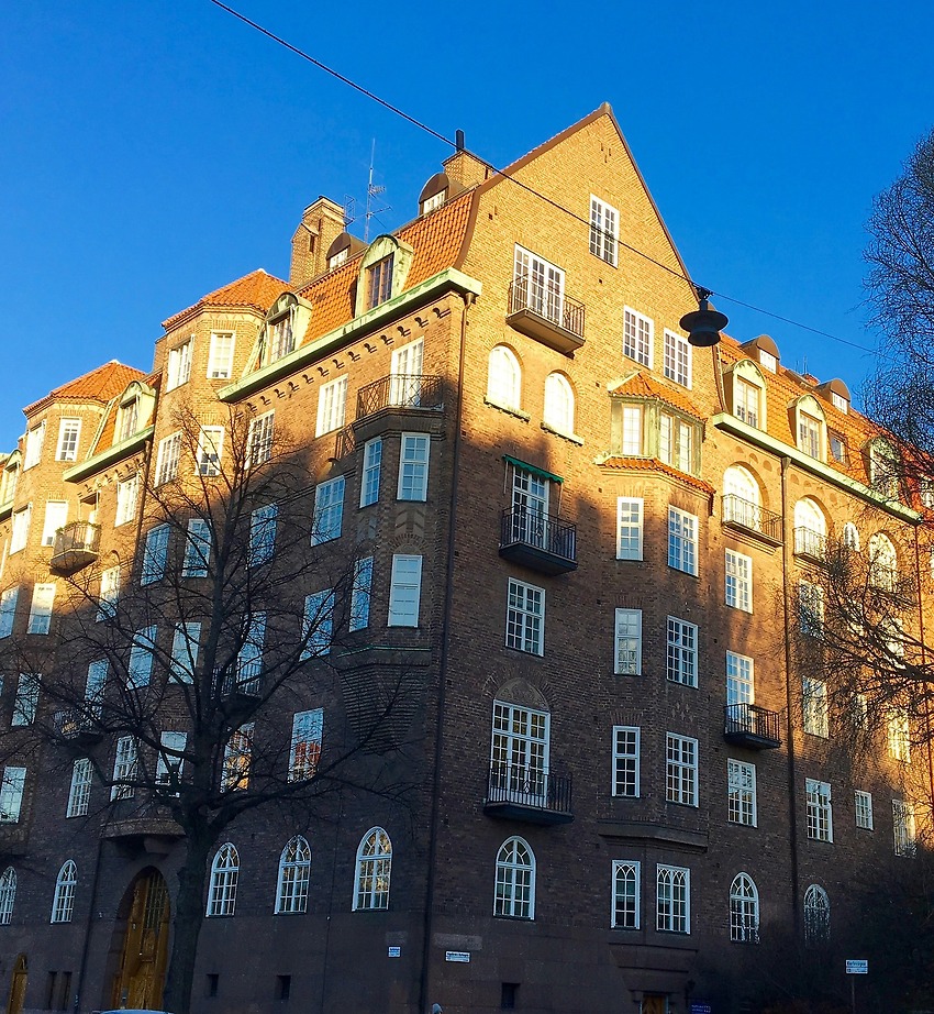 Ibland kan man se lite lägre flerbostadshus i nationalromantisk stil. Ni som känner mig eller har läst den här bloggen ett tag, vet att jag älskar stilen och kan knappt gå förbi ett hus utan att fota det. Idag såg jag ett lägre putsat hus i Nationalromantik med fina detaljer. De här lägre stadshusen kan ha tre våningar och en inredd vind. De är anpassade efter gatorna i mindre stadsbebyggelse.