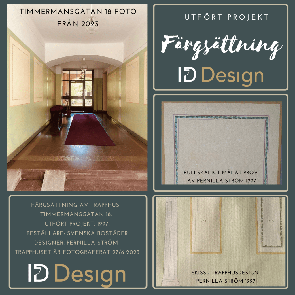 Se mer information i portfoliobladet nedan. Beställare var Svenska Bostäder år 1997 och designer var jag själv Pernilla Ström samma år. Foto på hur trapphuset ser ut idag är från 2023.
