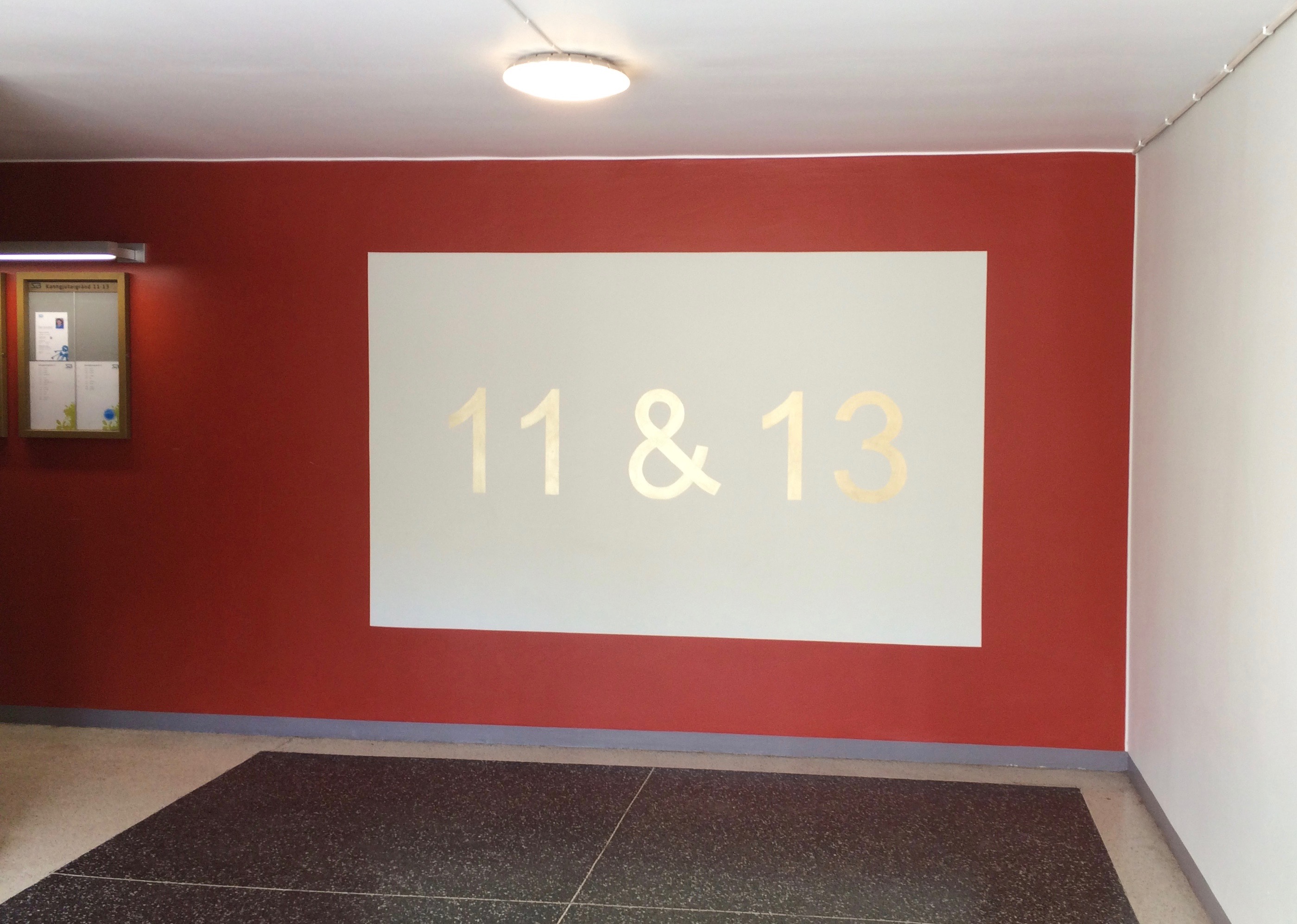 Mönstret och färgerna jag valde är mina egna. Men jag inspirerades av funktionalismens formspråk. Därför blev geometri och enkla former som block och rektanglar det jag valde till dessa trapphus liksom dämpade och lugna kulörer. De ”blå-turkosa” och ”aprikos-gula” trapphusen blev de två första färgställningarna i en serie av färgsättningar till Grimstagatan. Fondväggarna har ett geometriskt mönster som är något mer kulört än resten av trapphuset som istället har en blockindelning i mer dämpade kulörer.