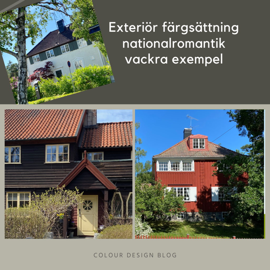 I Stora boken om byggnadsvård, kan man läsa att den nationalromantiska stilen var starkt påverkad av vår allmogetradition och delvis uppblandad med internationell jugend. Nationalromantiken såg falurött som en symbol för traditionen, (s. 275). Detta gällde i första hand hus med träfasader. De putsade husen var vanligen ljusa med mörka detaljer. Vidare kan man läsa att det också fanns de mörka, tjärfärgade kulörerna som ibland valdes till de största villorna i tung nationalromantisk stil, (s.296).